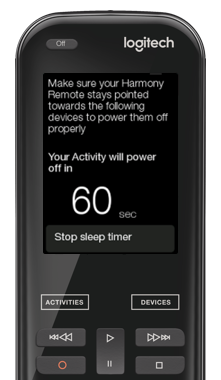 The sleep timer will turn off any running Activities once the time is up. Start your Activity, select MENU > Sleep Timer, and choose when you want Harmony to power everything off.