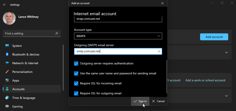 At the next window, enter your email address, username, password, account name, and sender name. You’ll also need to find and enter your service’s incoming and outgoing mail server names. You can locate this information by running a web search on the name of your email provider followed by the terms “IMAP,†“POP,†or “SMTP.†Under Account type, select either POP3 or IMAP4, depending on which protocol you want to use. Keep the four options checked and click Sign in.