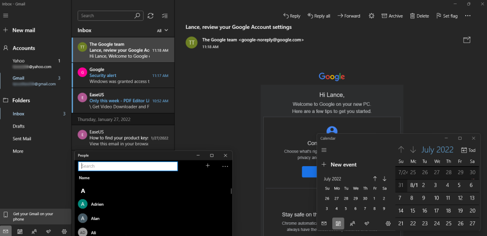 Once everything is set up, open the Windows Mail app to see all the accounts added in the left hand pane. Click a specific account to open its inbox. Select the Calendar and People icons in the lower-left corner to view the appointments, events, and contacts from all your accounts.