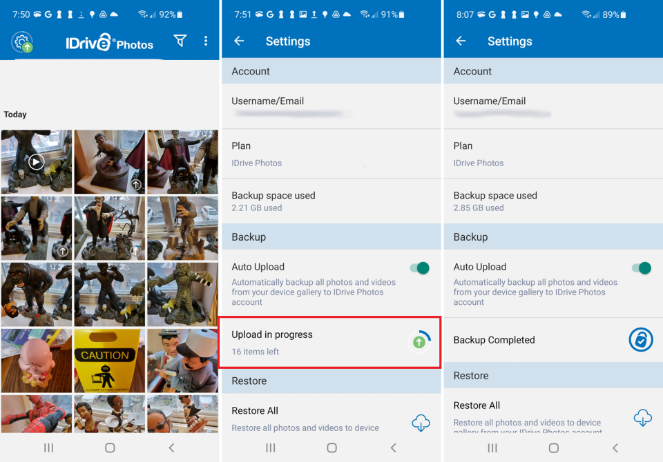 After the initial upload, you may want to tweak some of the settings in the app, which you can do at the Settings screen. If you’d rather not have new photos and videos automatically backed up to iDrive, turn off the switch for Auto Upload. You can always turn it back on, and any photos or videos not yet uploaded will then be sent to iDrive.