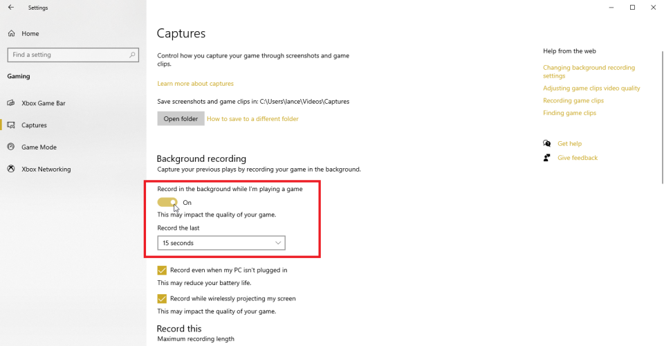 In Windows 10, go to Settings > Gaming > Captures and turn on the switch for Record in the background while I'm playing a game. While here, click the drop-down menu for Record the last to change the interval to anywhere from 15 seconds to 10 minutes.