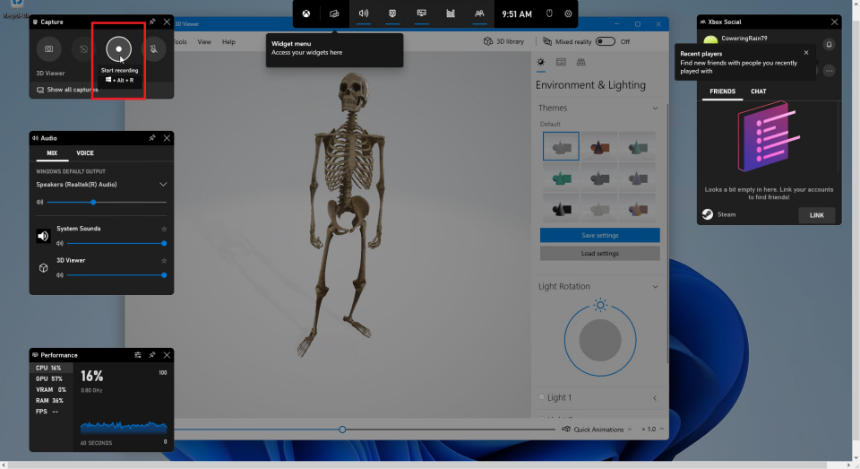 Several Game Bar widgets pop up with options for capturing screenshots, controlling your video and audio, and viewing your Xbox social account. The pane also displays the name of your current app, file, or window as the source for the video capture.