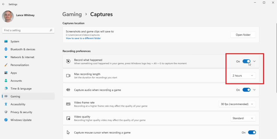 In Windows 11, go to Settings > Gaming > Captures and turn on the switch for Record what happened. Here, you can set the max recording length to 30 minutes, 1 hour, 2 hours, or 4 hours.