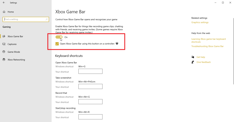 To enable that feature, click the checkbox for Open Xbox Game Bar using this button as a controller. From this screen, you can also change any of the keyboard shortcuts associated with opening the Game Bar, taking a screenshot, and recording a video.