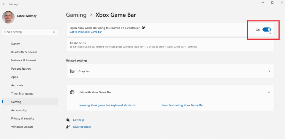 In Windows 11, go to Settings > Gaming > Xbox Game Bar. To use an Xbox controller or Xbox 360 controller, turn on the switch for Open Xbox Game Bar using this button as a controller. In Windows 11, you can’t change any of the keyboard shortcuts at the Windows settings screen; you’ll have to do that through the settings in the Xbox Game Bar app itself.