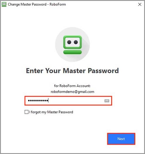 5) You will be prompted to enter your current Master Password. Enter it, and click the blue "Next" button.