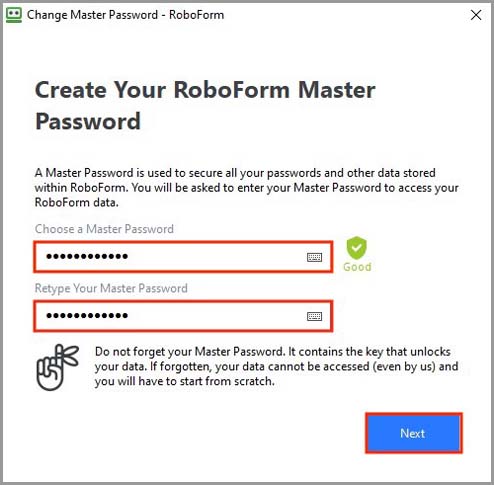 6) Enter a new and secure Master Password that you will be able to remember and then re-enter it to confirm. Then, click the blue "Next" button.