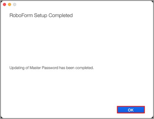 7) A RoboForm window will display confirming that the Master Password change was successful. Click the blue "OK" button.