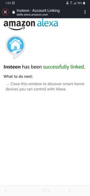After you see confirmation that Alexa has been linked with your Insteon Hub, tap the “X†in the upper left corner.