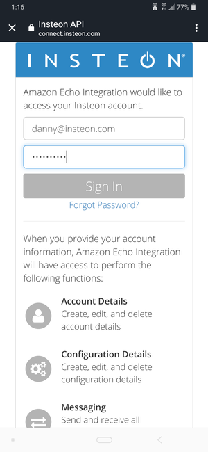 To connect your Insteon Hub to your Amazon Echo, you will need to enter your Insteon account user name and password. When finished, tap Sign In.