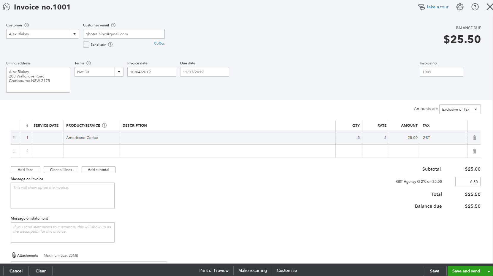 Complete the on-screen invoice, including selecting a customer, adding date, invoice number, whether amounts are tax inclusive/exclusive/out of scope of GST, Products, and Services of your choosing, the quantity, description, and rate of each, and the GST code.