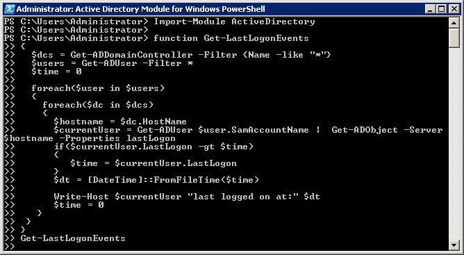 Import-Module ActiveDirectoryfunction Get-LastLogonEvents{$dcs = Get-ADDomainController -Filter {Name -like "*"}$users = Get-ADUser -Filter *$time = 0foreach($user in $users){foreach($dc in $dcs){ $hostname = $dc.HostName$currentUser = Get-ADUser $user.SamAccountName | Get-ADObject -Server $hostname -Properties lastLogonif($currentUser.LastLogon -gt $time) {$time = $currentUser.LastLogon}$dt = [DateTime]::FromFileTime($time)Write-Host $currentUser "last logged on at:" $dt$time = 0}}}Get-LastLogonEvents