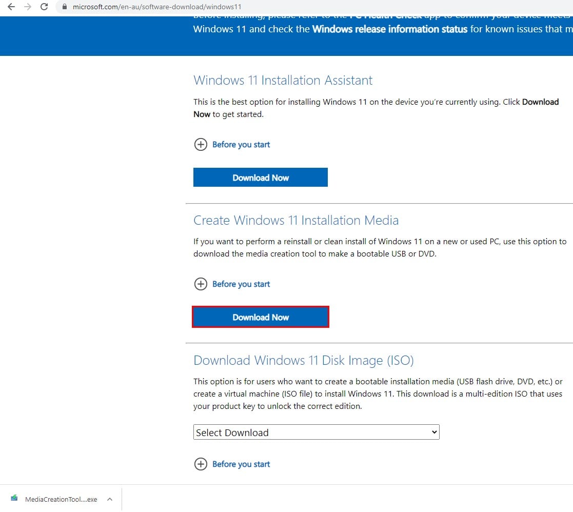 you need to click on download now next to create windows 11 installation media to download the media creation tool on your device