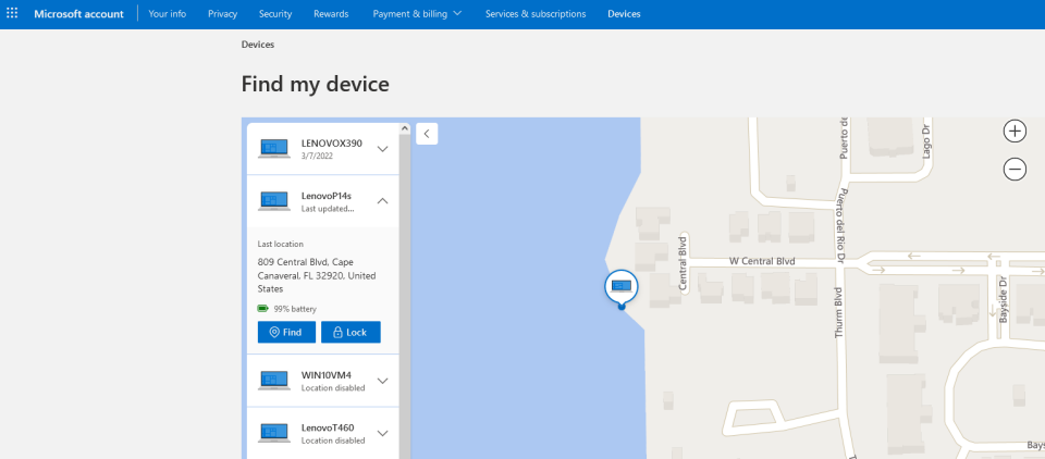 If Find My Device is on, you will see each device's last recorded location. Don’t worry if the page shows an older location and date for a device; that information will be updated when you ping the device. If the missing device is turned on, simply click Find my device.