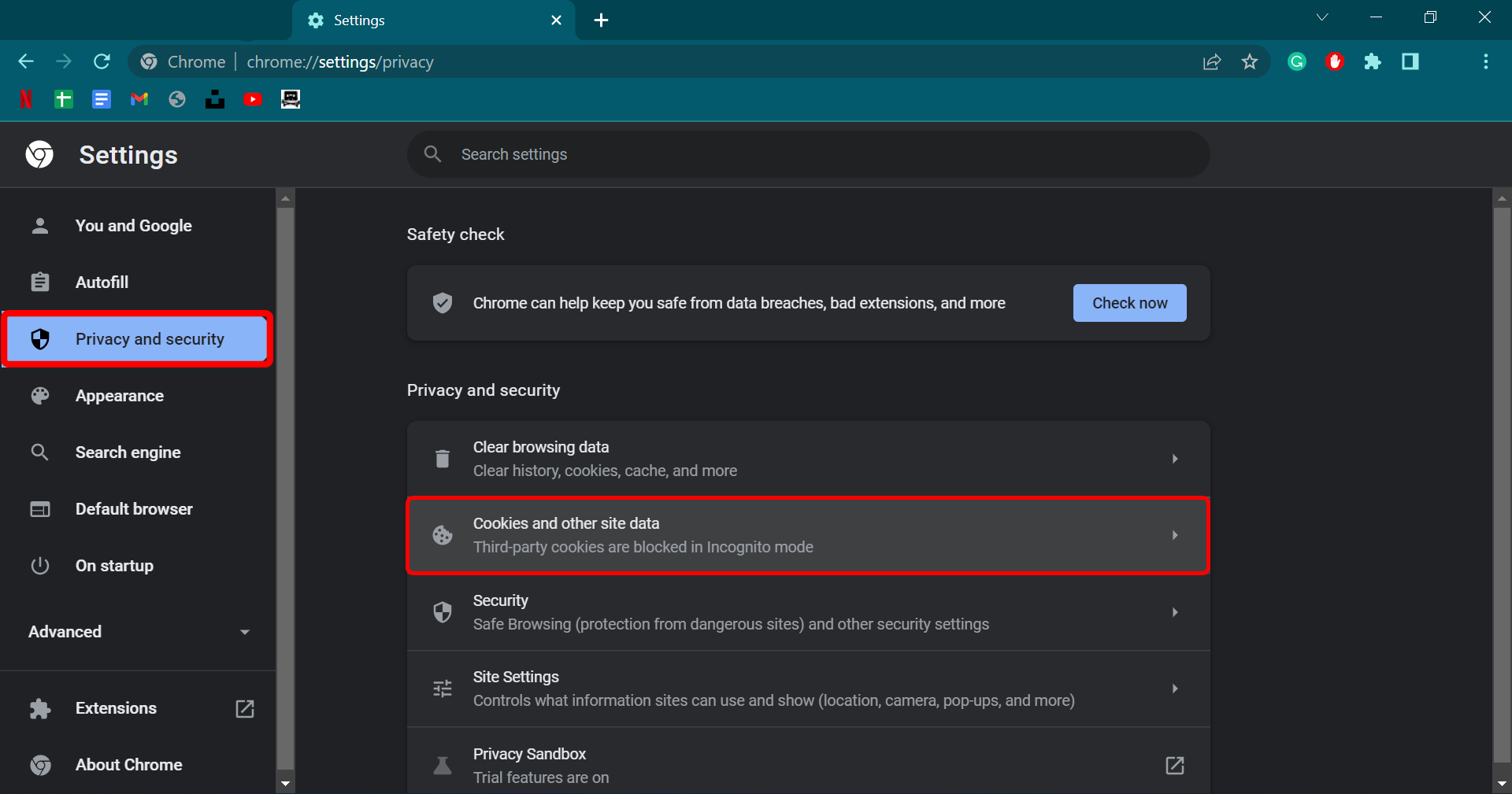 Go to Privacy and security, then tap on Cookies and other site data.