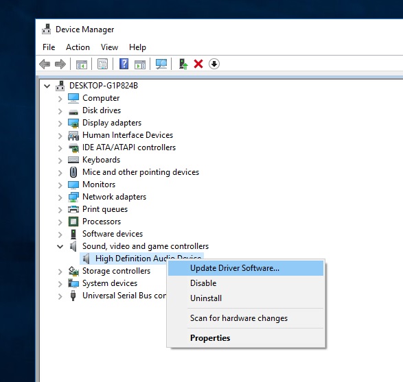 Right-click on the Sound card and click on Update driver software.