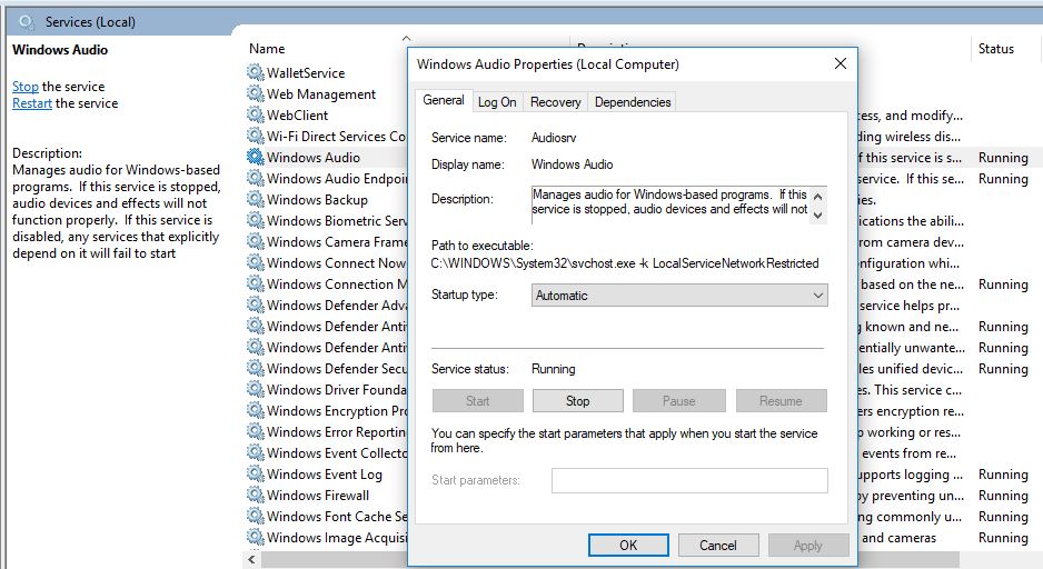 If not Right click on service (windows audio) select properties.