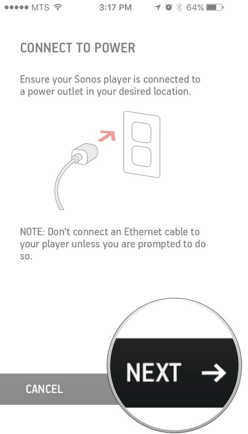 Tap Next on the Connect To Power screen. Make sure your Sonos is plugged in before you continue!