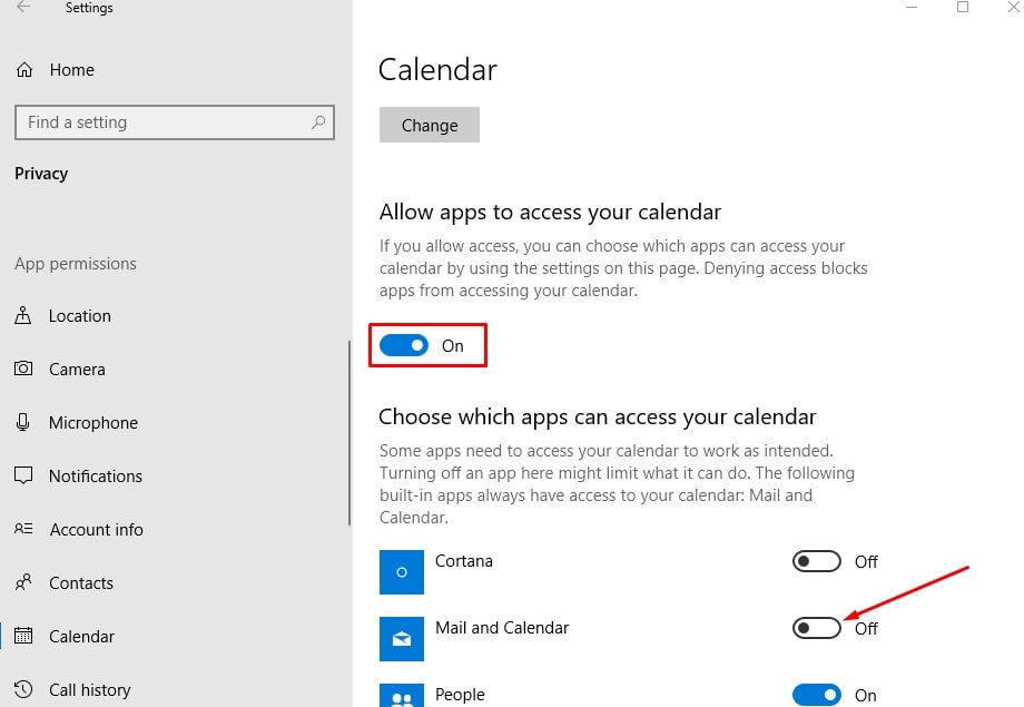Go to Start Menu > Settings app > Privacy section > Calendar