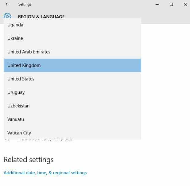 Under Country or Region, click on English (United Kingdom), and if not there, you can add it using Add a Language button