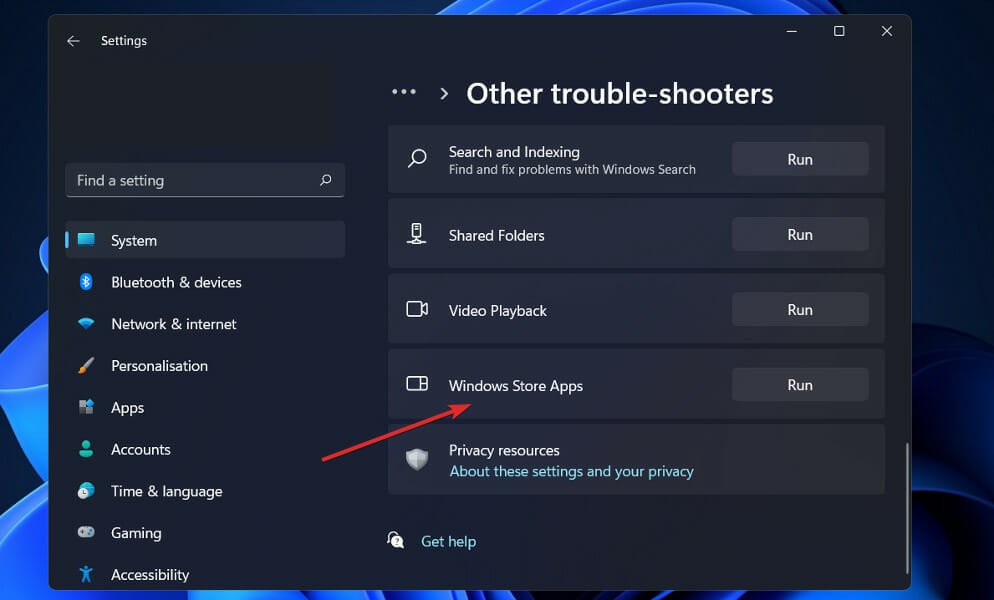 Now, scroll down until you come across the Windows Store Apps troubleshooter, and click the Run button next to it to start the process.