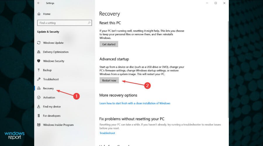 Select Recovery from the left pane and select Restart now under Advanced startup.