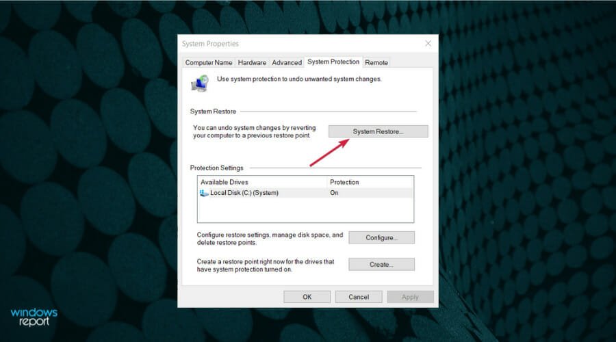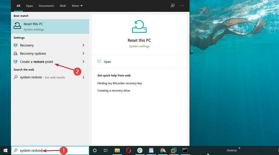 Click Start and type system restore in the search box, then click on Create a restore point.