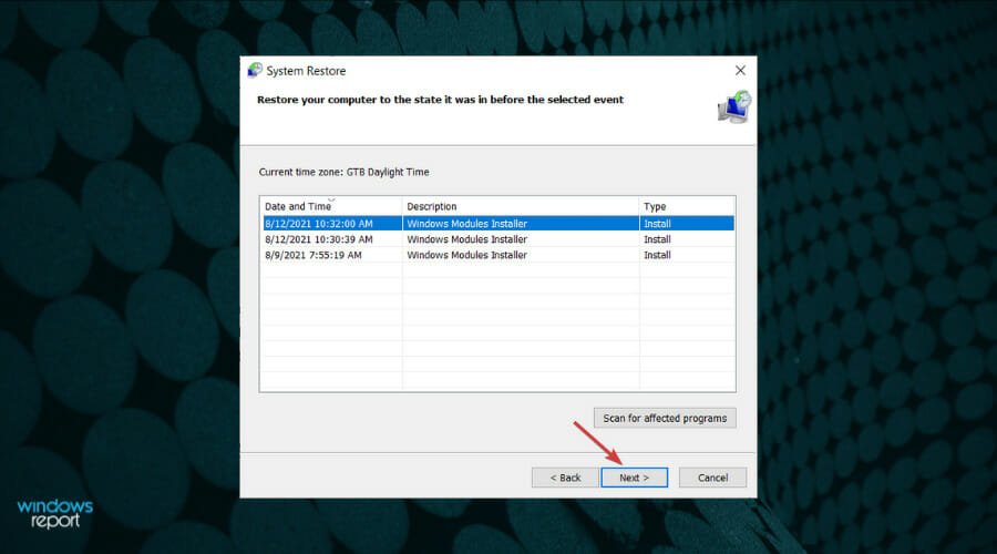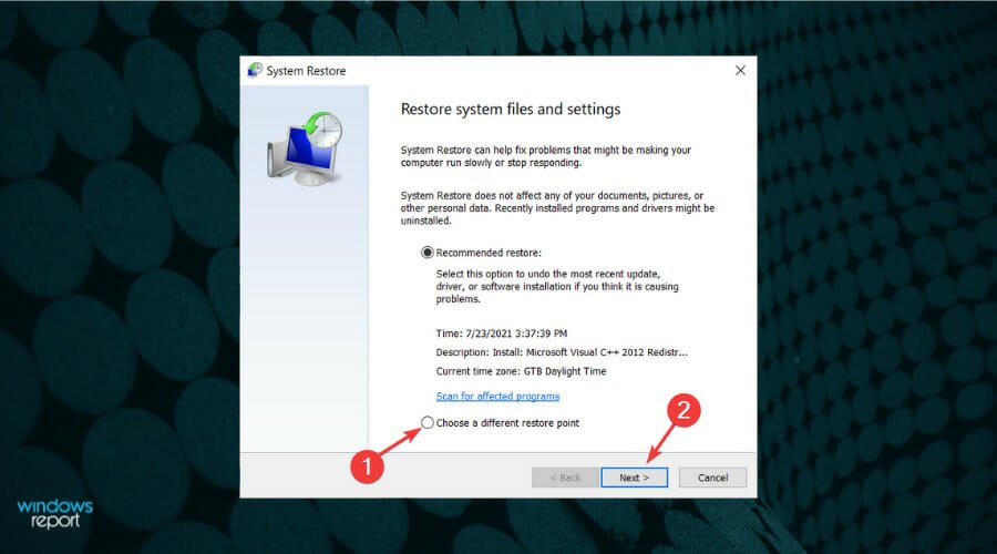 Hopefully, the system will restore to the point in time before the Outlook problem started manifesting and now it works fine again.