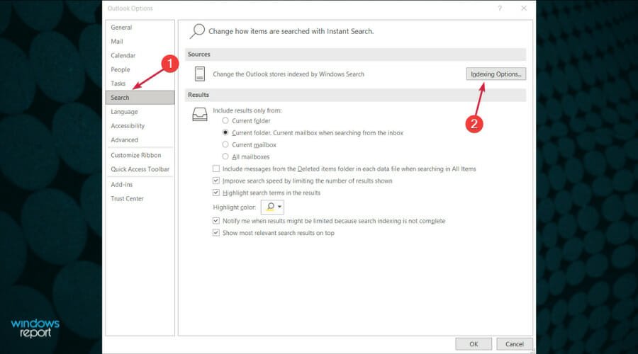 Rebuilding the index of Outlook should also repair the Search function and after this process, the app should work smoothly again.