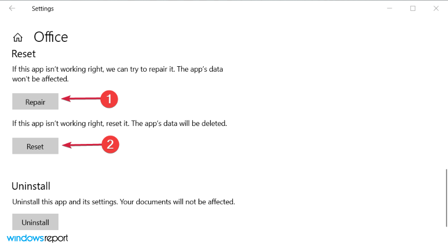 Now scroll down and click on the Repair button. Check if Outlook is working well again. If not, come back to the window and click the Reset button.