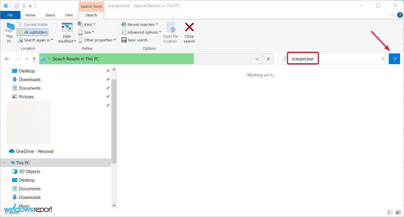 Type scanpst.exe in the address bar and press Enter or click the blue arrow to search for the file.