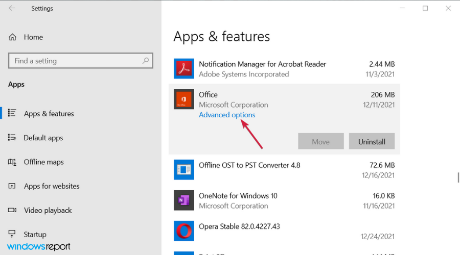 Look for Office or Microsoft Office in the list of aps, click on it to expand, and select Advanced options.