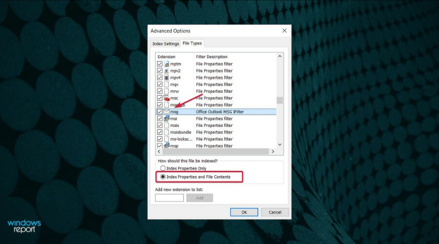 Scroll down until you find msg in the Extension column, select it and make sure that the Index Properties and File Contentsoption is enabled. If not, click on its box to do so.