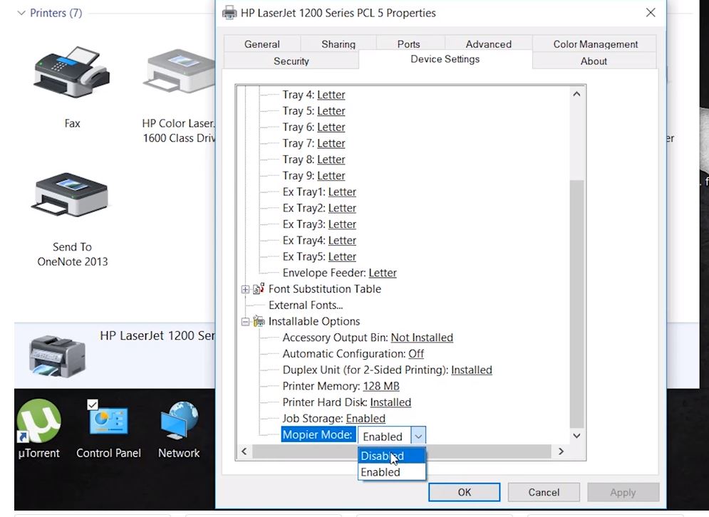 One of the Users recommend on the Microsoft forum, Disable Mopier mode help to resolve the issue “Printer stuck after one page printâ€