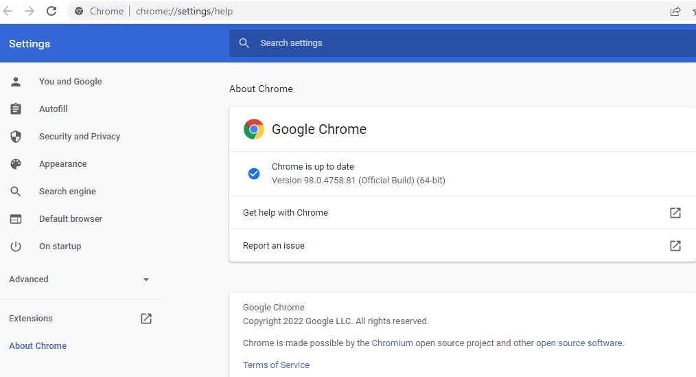 5. After Chrome browser updates, re-launch the browser and check the latest build should work smoothly.