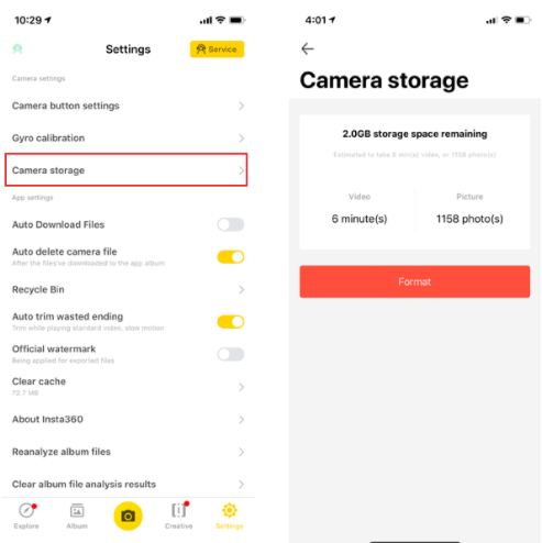 Open the GO app, enter Settings -> Select camera storage-> tap "Format"