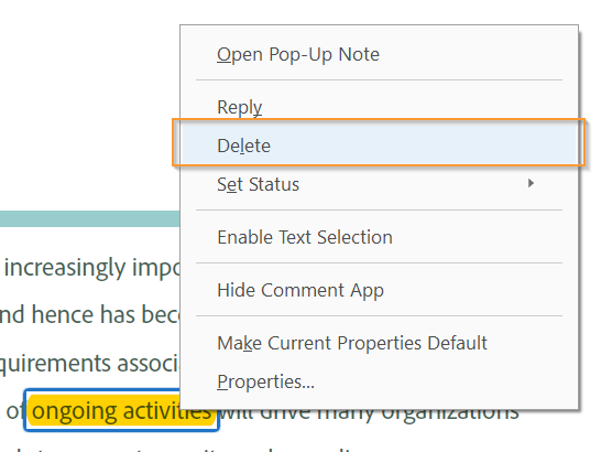In case you need to delete the highlight on the text (without deleting the text), right-click (Windows) or Control-click (Mac OS) on the highlighted text and click Delete.