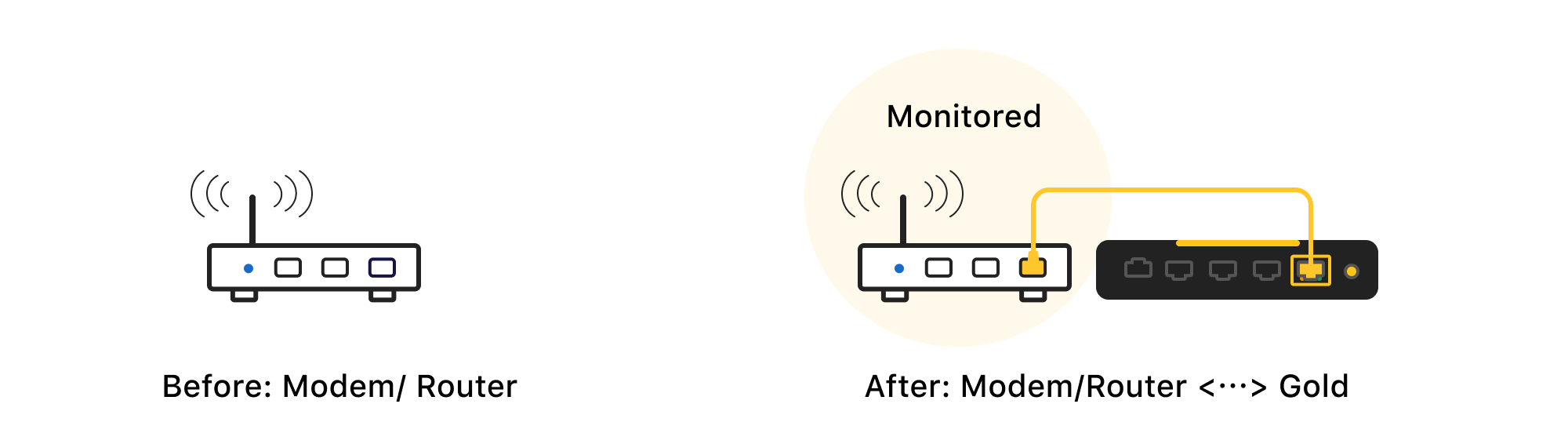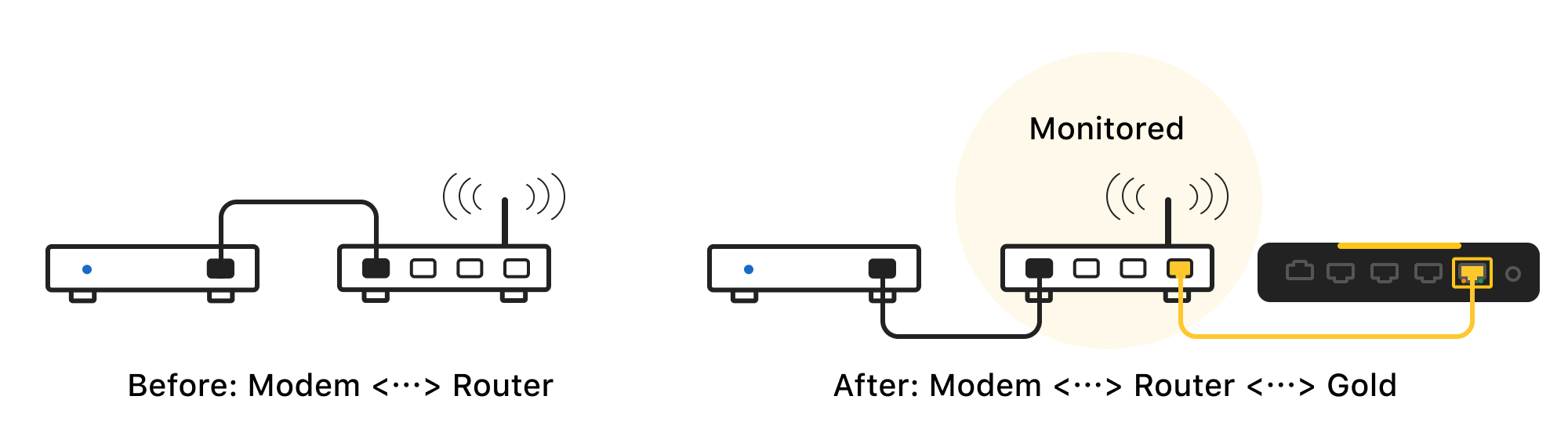 Connect Gold to the LAN Port of a Router, then connect your devices to Gold's other ports. All network flows passing through Firewalla will be monitored and controlled.