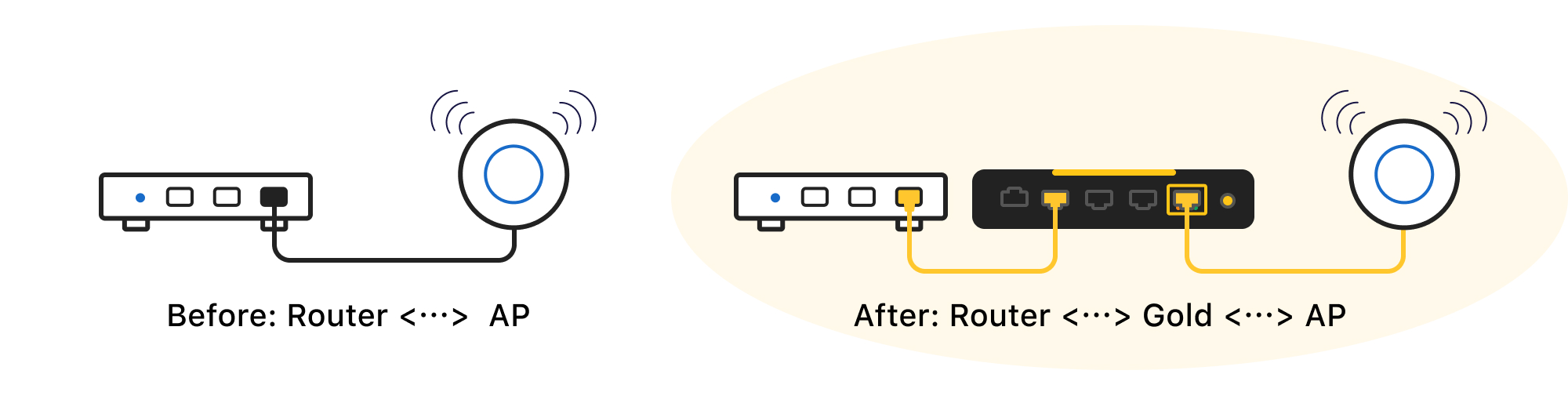 Connect Gold's WAN Port to the LAN Port of Modem/Router, then connect your devices to Gold's LAN ports.