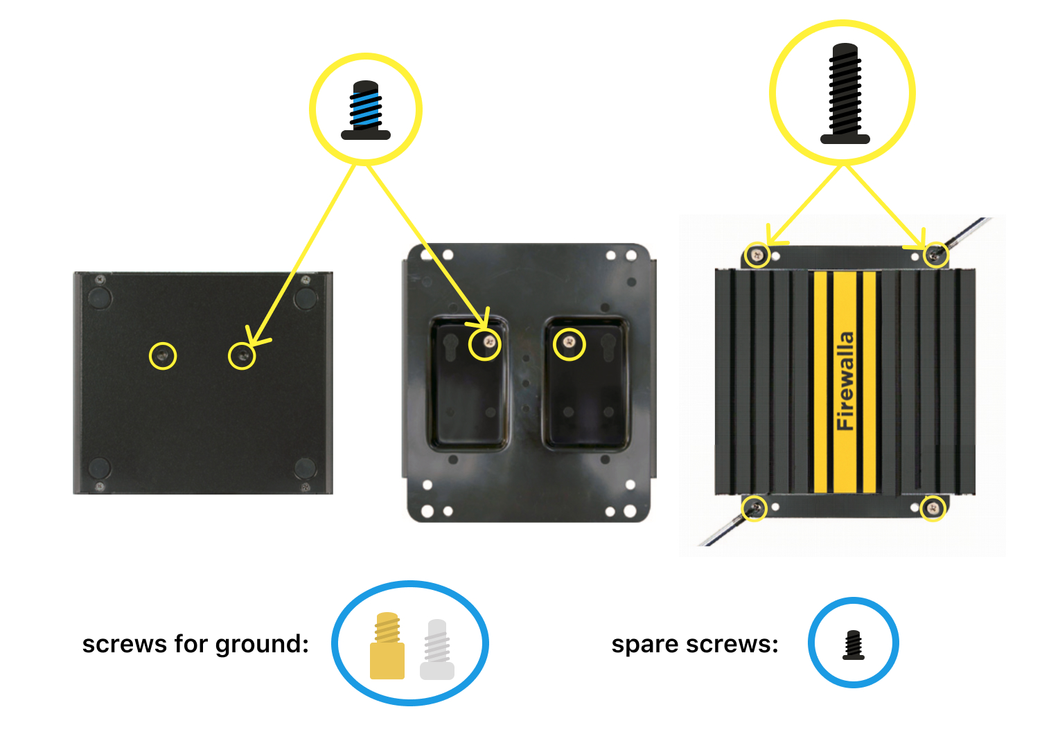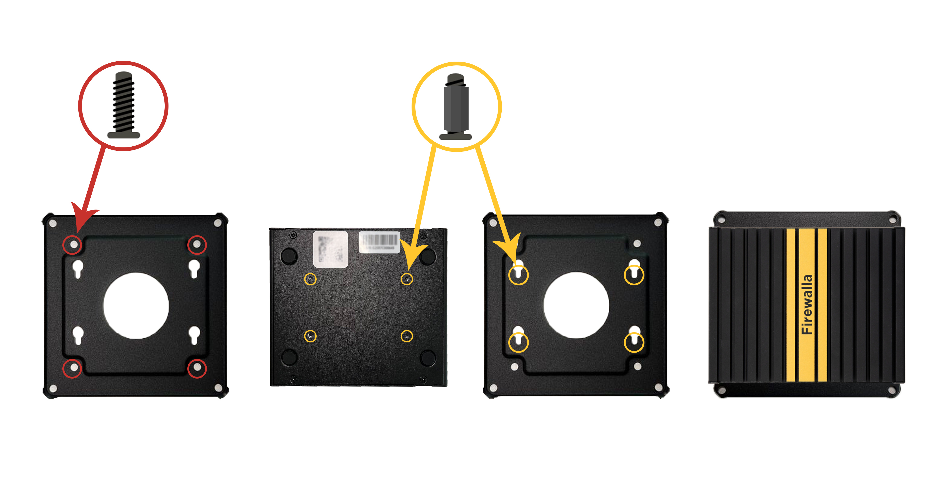 2. Locate the four screw holes on the cover of the Firewalla box, and tighten up with the four screws highlighted in yellow color.