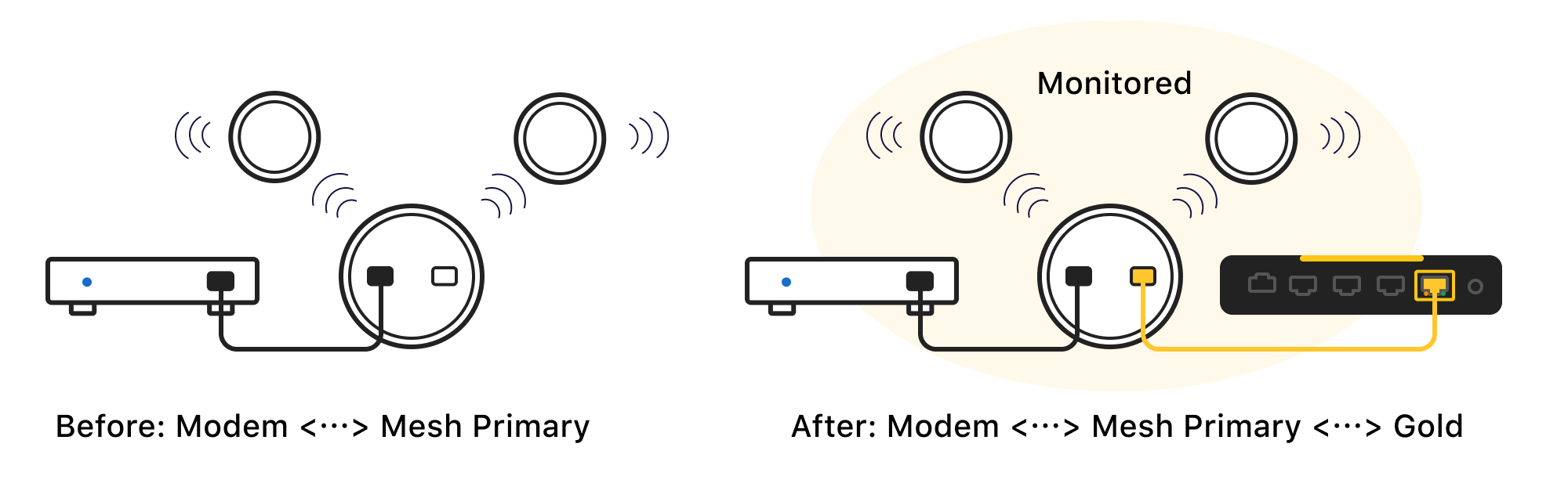 Connect Gold's Ethernet Port 4 to the LAN port of the primary device (not the satellite device). After installation, please disable the monitoring of the satellite devices in the Firewalla app after app installation. You will find more Mesh Router Guide here.