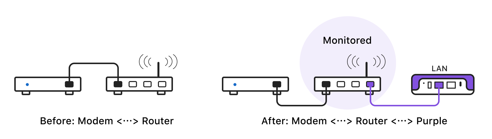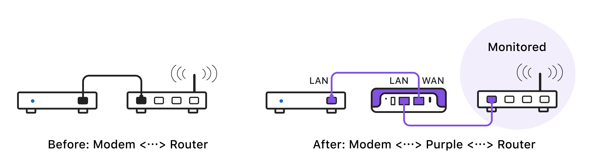 Connect Purple's WAN Port to the LAN port of your router, then connect the rest of your devices to Purple's LAN port. All network flows passing through Firewalla will be monitored and controlled.