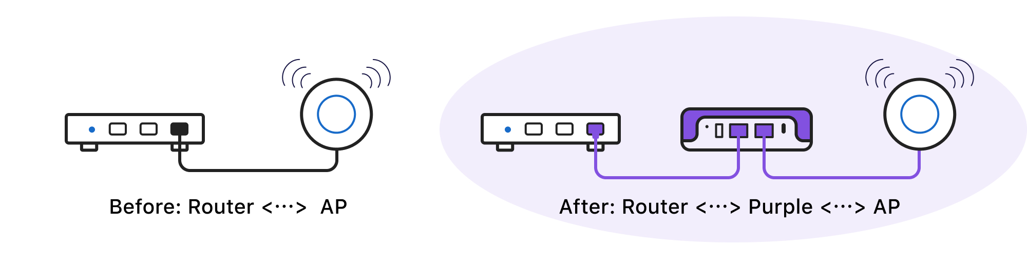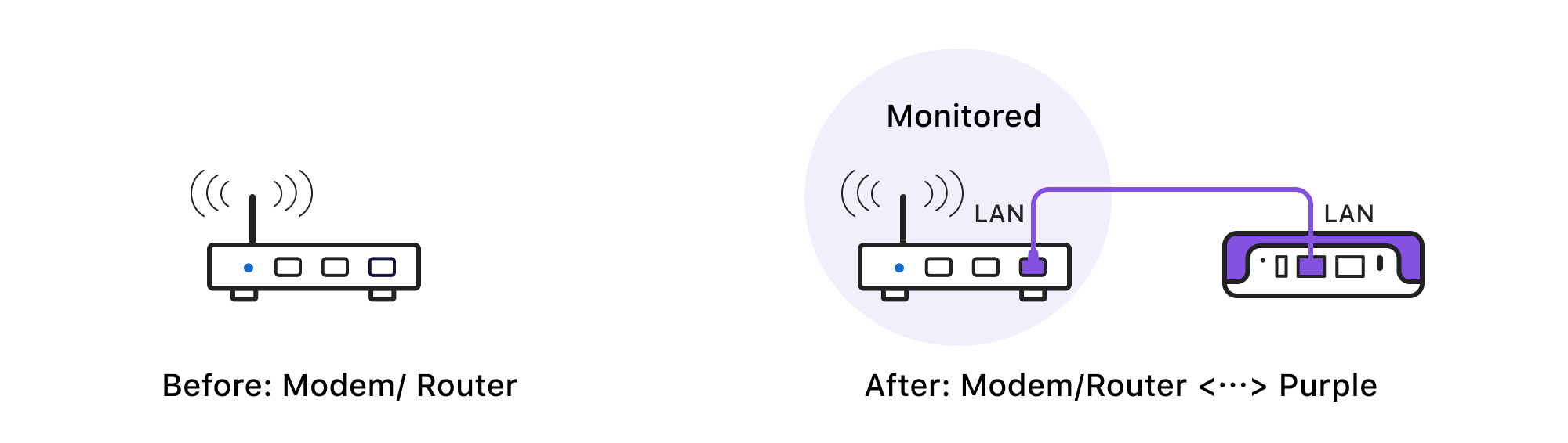 Connect the Purple's WAN port to the LAN port of Modem/Router, then connect your devices to the Purple's LAN port.