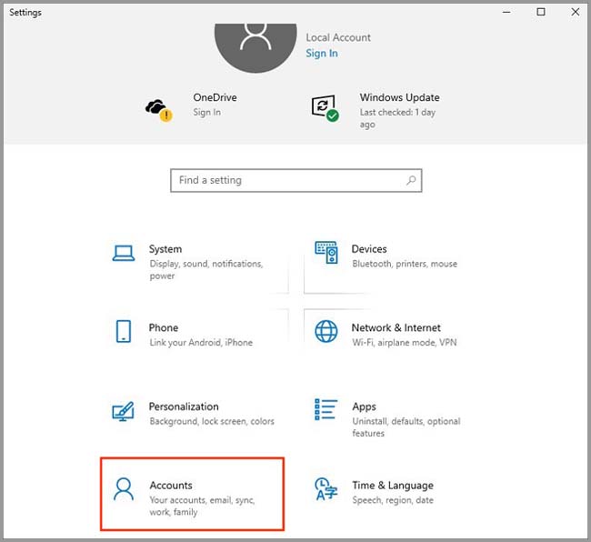 2) Select "Accounts" on the Settings page