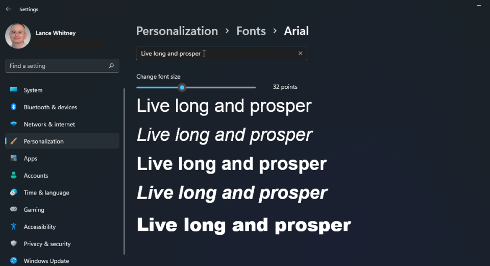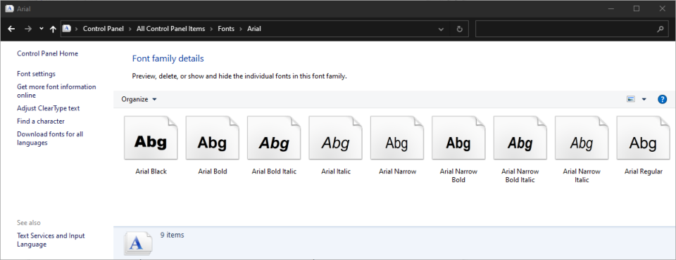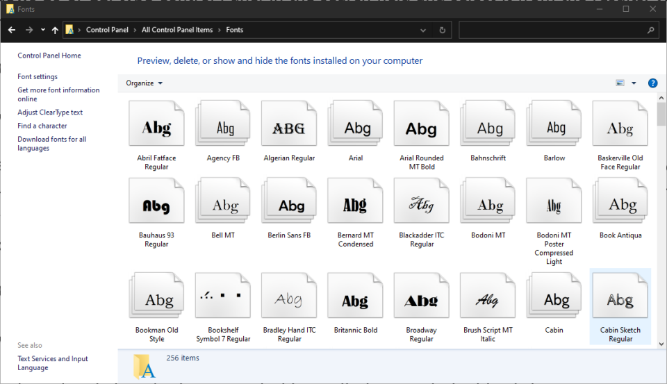 To see more details on a specific font, click on it. Windows displays the font with various attributes. Move the slider left or right to see the font at different sizes.