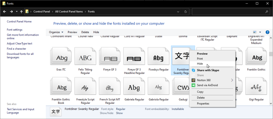 To hide a font, right-click on it and select Hide from the pop-up menu. You can also automatically hide all fonts that aren’t designed for your language settings. To do this, click the link for Font settings on the left sidebar. In the Font settings window, check the box to Hide fonts based on language settings. Click OK.
