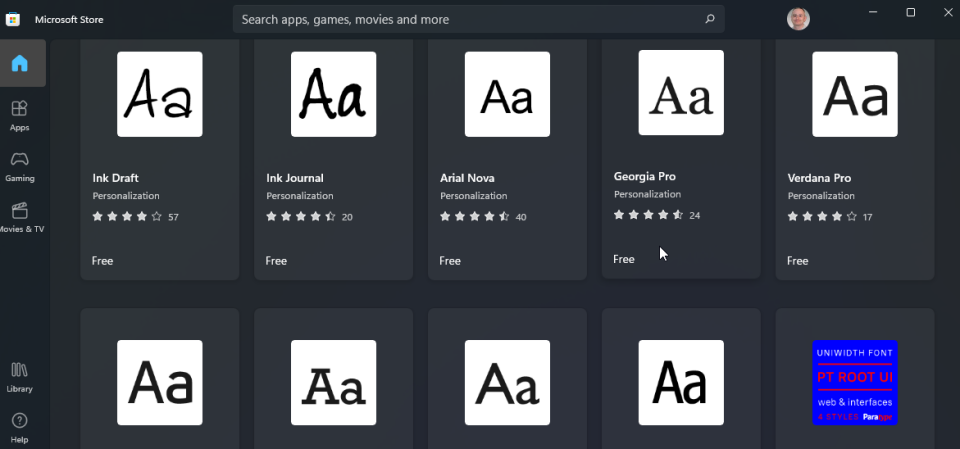 The Microsoft Store displays all the available fonts. Most fonts are free; some cost a minor fee. Select the font you want to add.