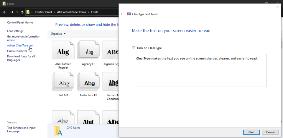 Click the link for Adjust ClearType text to see if you can improve the display of ClearType fonts on your screen.