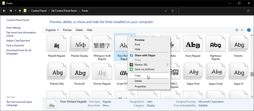 The Fonts applet in Control Panel offers more features and commands. In the left pane, click the link for Font settings. You can opt to hide fonts that aren’t in your default language and install a font’s shortcut instead of the actual font to save disk space.