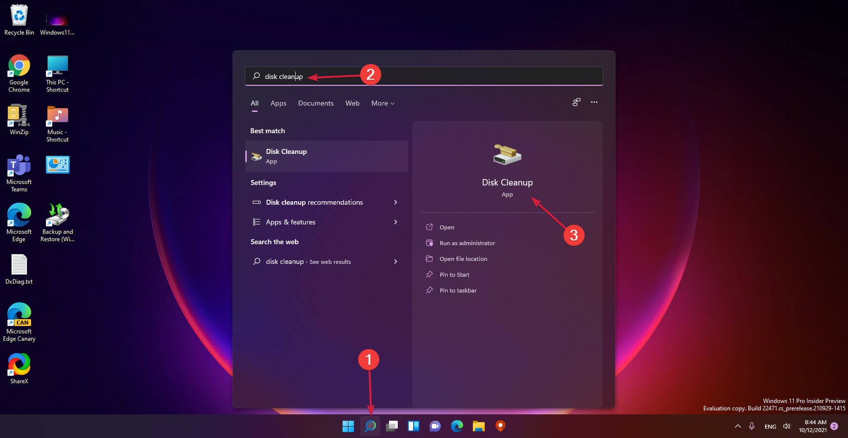 Click the Search button in your taskbar, type disk cleanup, and click on the app from the results.